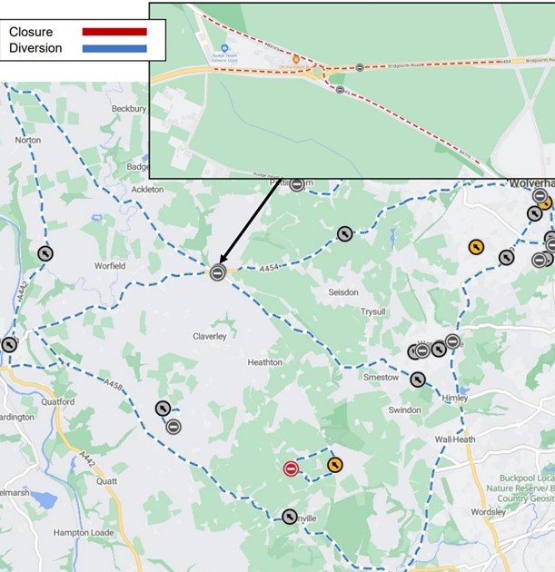 The A454 Royal Oak Roundabout at Hilton (near Claverley) is to be resurfaced from Monday 16 to Saturday 21 February [2026].
