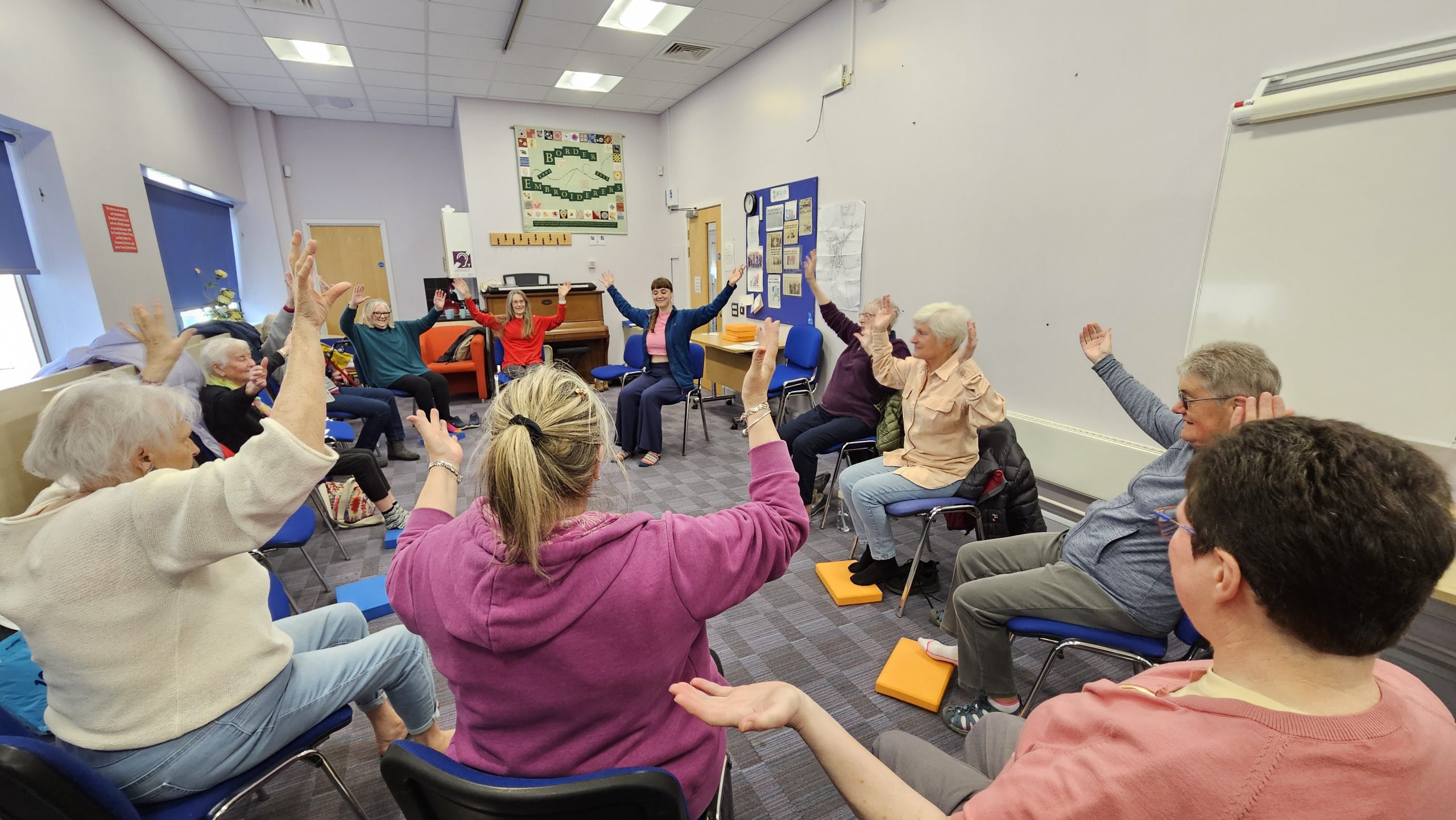 Trying chair yoga at a Warm Welcome event in Oswestry