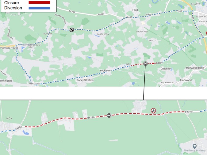 The B4386 from the Nox junction to the Cruckton junction is to be resurfaced from Monday 9 to Friday 13 March [2026].