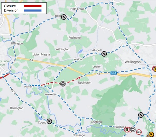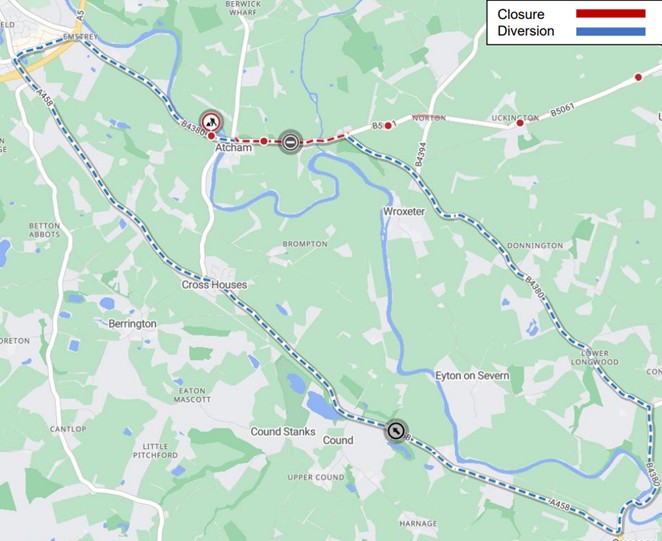 The B4380 and B5061 from Atcham to Uppington (see map below) will be treated between Tuesday 14 April and Wednesday 27 May [2026]. Work will be carried out in three phases as follows, when the road will be closed from 9.30am to 4pm on weekdays, and from 6am to 6pm on weekends.